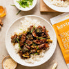 Add white rice to your plate and top with the Honey Garlic Beef and Broccoli.