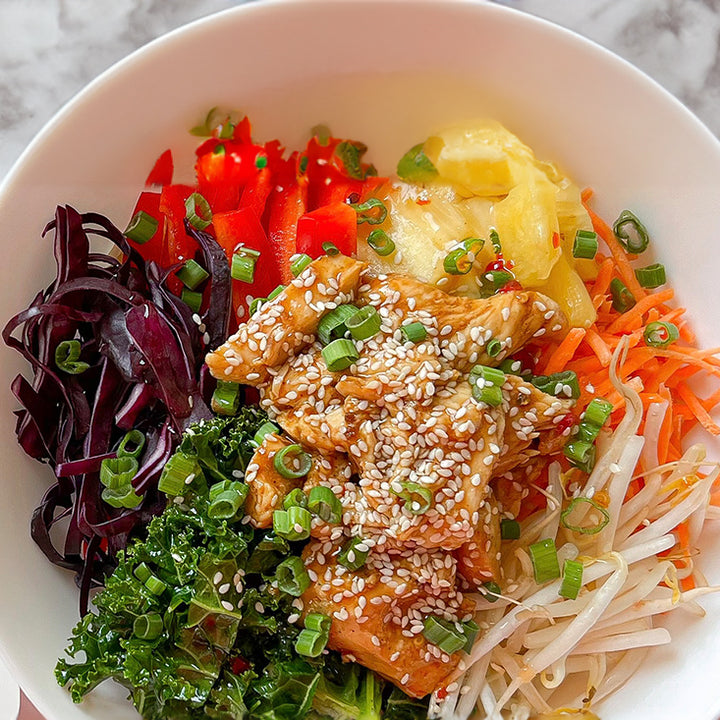 Begin assembling the Buddha bowls by adding ½ cup of brown rice to a bowl, followed by ½ cup of shredded carrots, 1 cup of sliced pineapple, ½ cup of sliced red bell pepper, ½ cup of sliced red cabbage, 1 cup of massaged kale, 1 cup of bean sprouts, and 1 cup of Kevin’s Kung Pao Chicken.