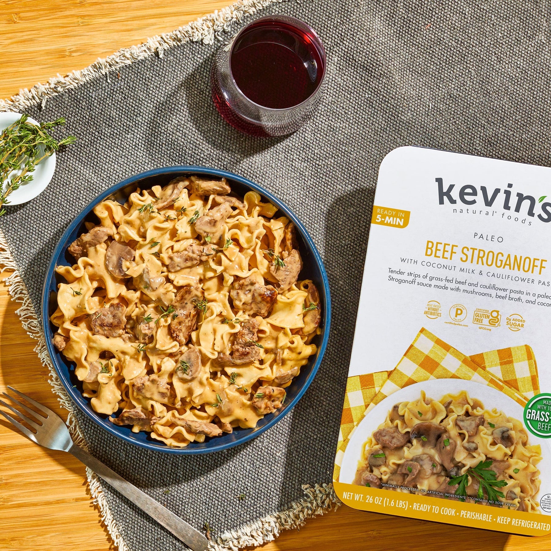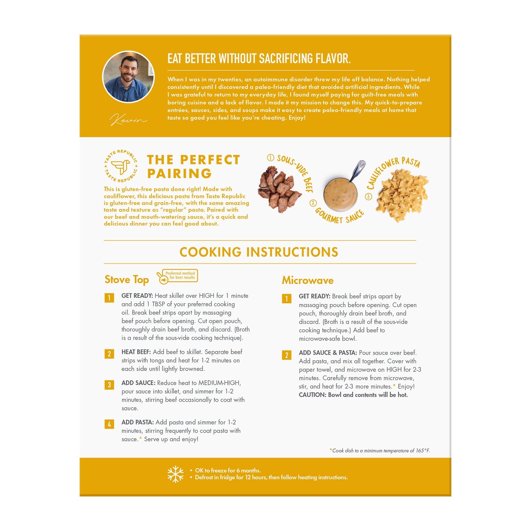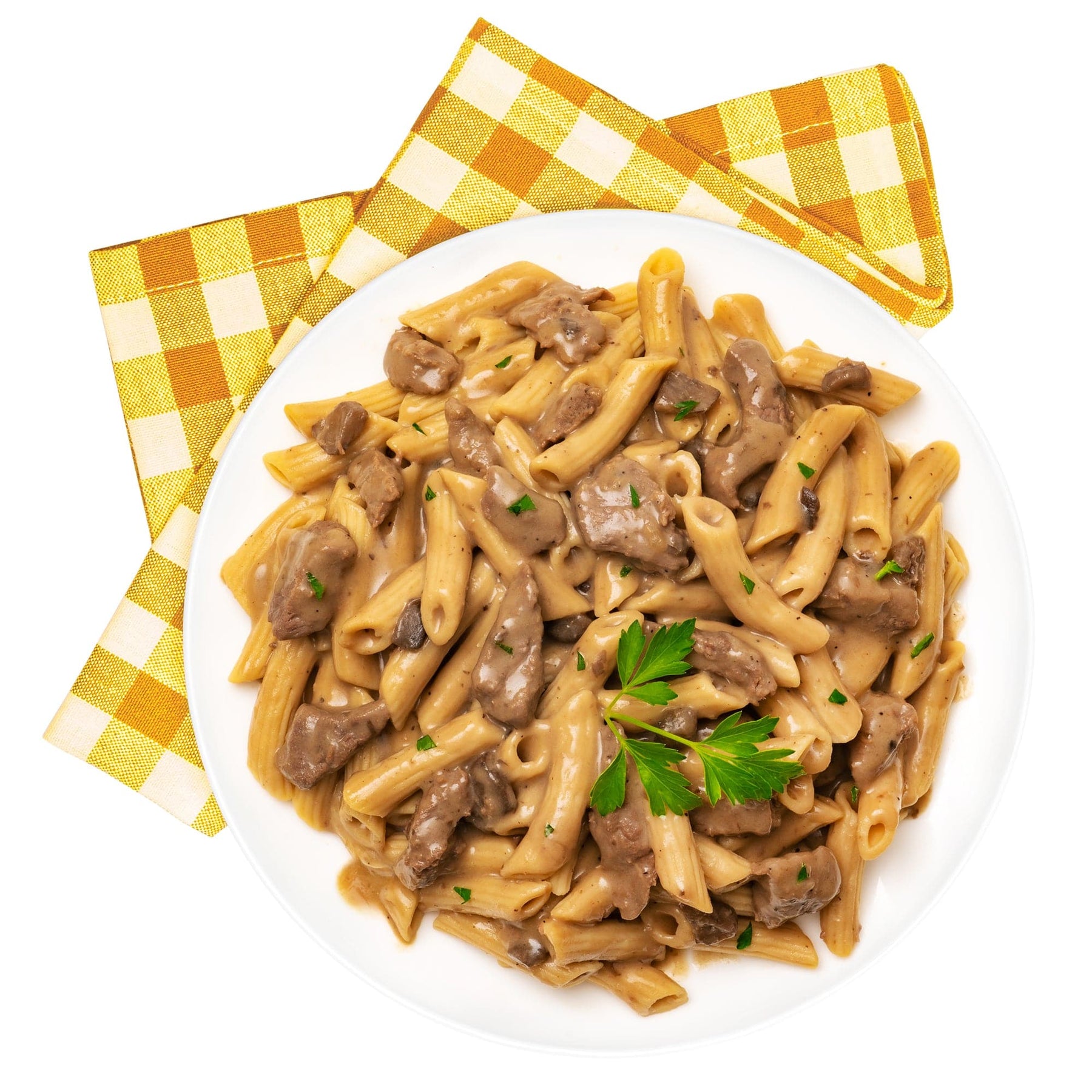 Stroganoff Sauce (Top Sirloin Beef Strips, Mushrooms, Water, Coconut Milk [Coconut Cream, Water], Onion, Clarified Butter [Milk], Chablis Wine, Chicken Stock [Chicken Stock, Salt], Chicken Fat, Yeast Extract, Dehydrated Roasted Garlic, Tapioca Starch, Xanthan Gum, Dehydrated Mushroom, Black Pepper, Spice), Cauliflower Pasta (Water, Cauliflower Powder, Potato Starch, Tapioca Starch, Whole Egg, Egg White, Xanthan Gum, Salt, Konjac).