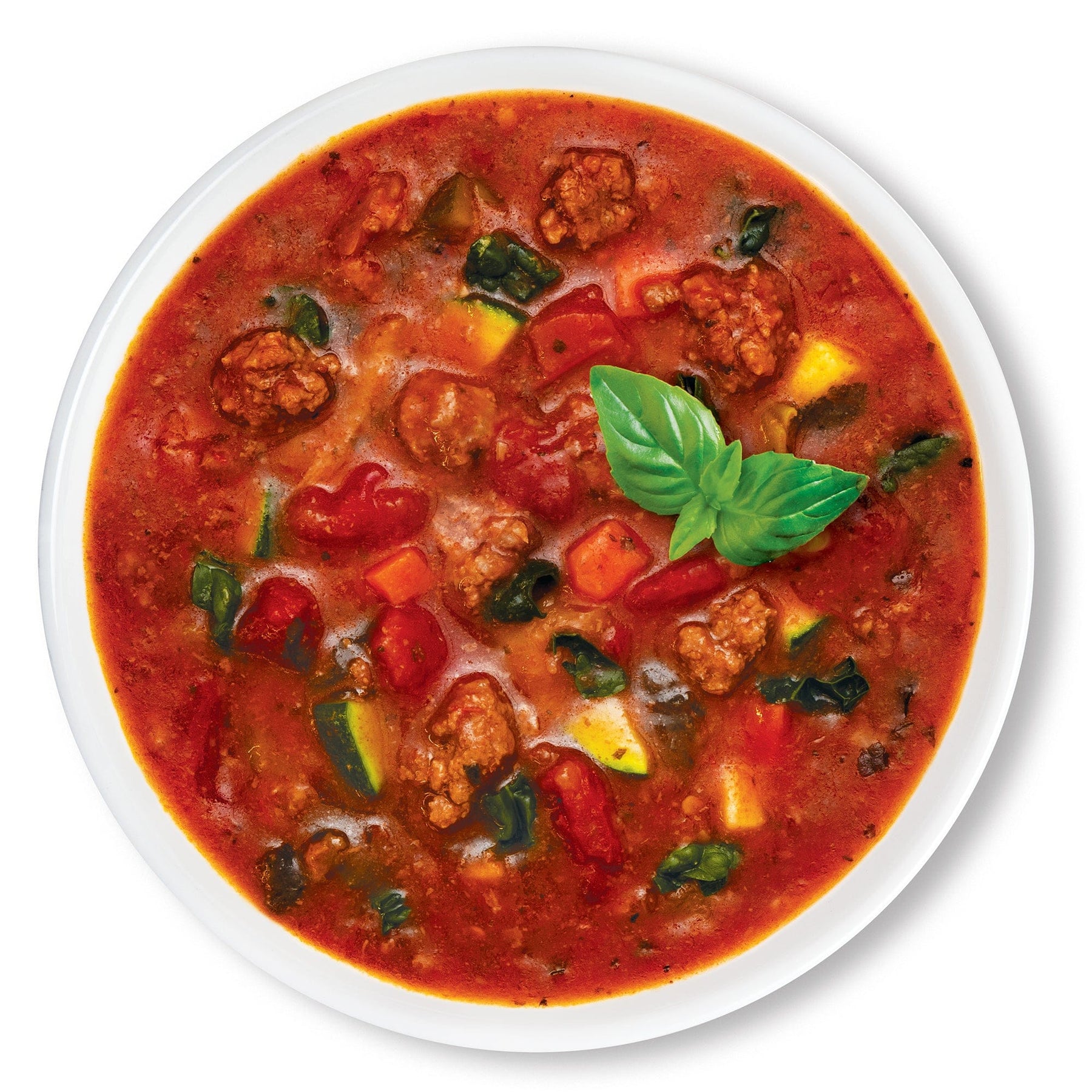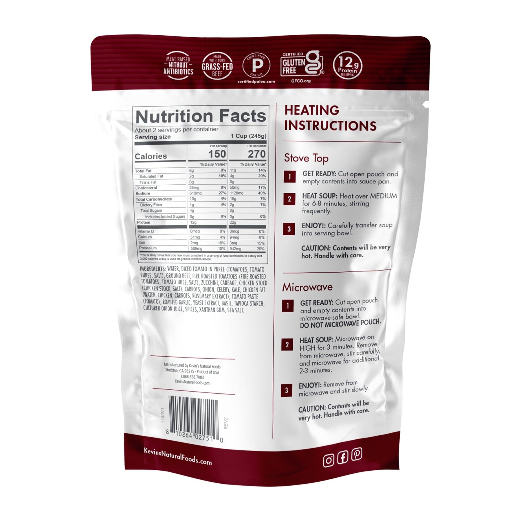 Water, Diced Tomato In Puree (Tomatoes, Tomato Puree, Salt), Ground Beef, Fire Roasted Tomatoes (Fire Roasted Tomatoes, Tomato Juice, Salt), Zucchini, Cabbage, Chicken Stock (Chicken Stock, Salt), Carrots, Onion, Celery, Kale, Chicken Fat (Water, Chicken, Carrots, Rosemary Extract), Tomato Paste (Tomato), Roasted Garlic, Yeast Extract, Basil, Tapioca Starch, Cultured Onion Juice, Spices, Xanthan Gum, Sea Salt.