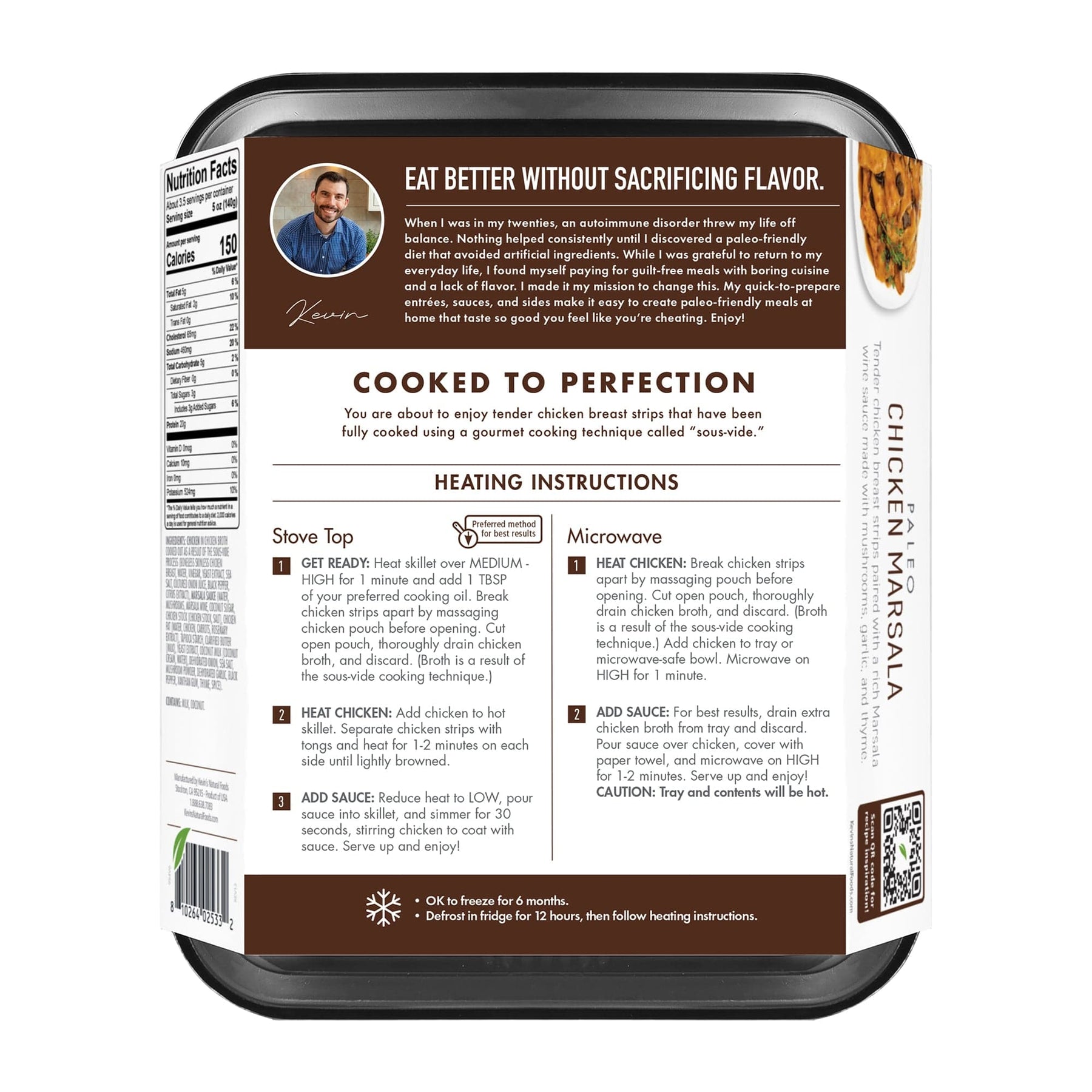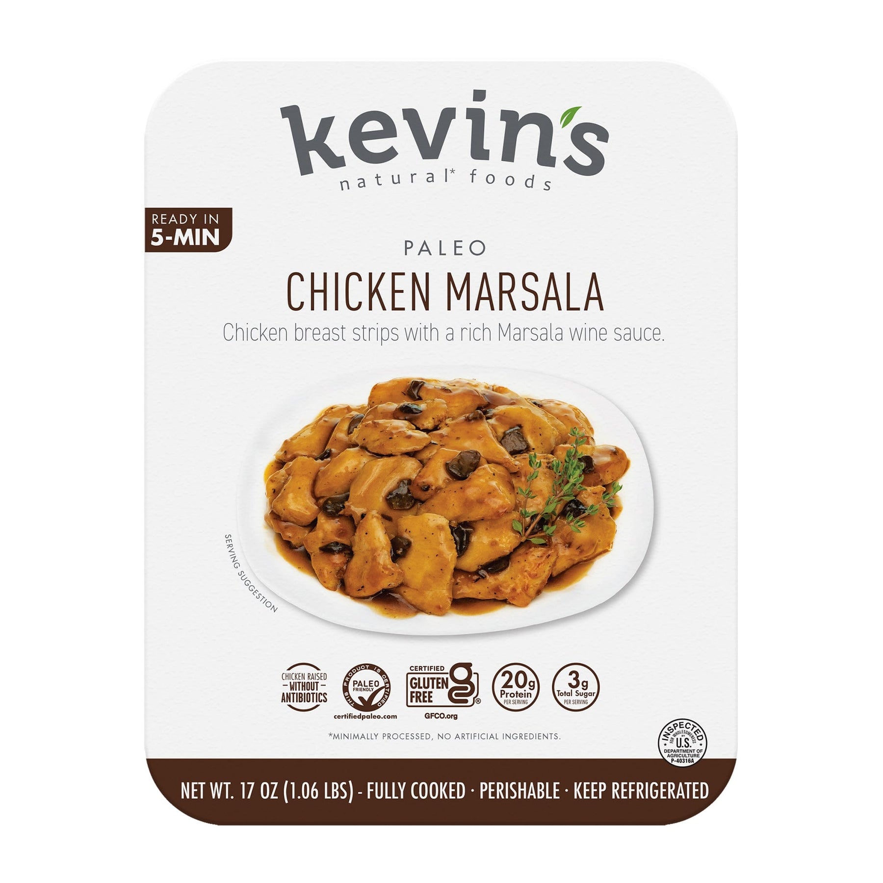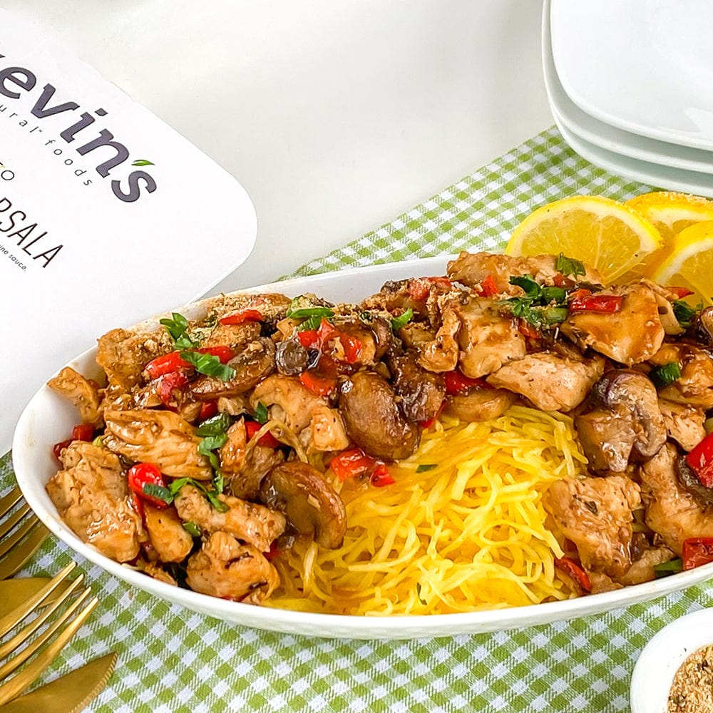 Chicken In Chicken Broth Cooked Out As A Result Of The Sous-Vide Process (Boneless Skinless Chicken Breast, Water, Vinegar, Yeast Extract, Sea Salt, Cultured Onion Juice, Black Pepper, Citrus Extract), Marsala Sauce (Water, Mushrooms, Marsala Wine, Coconut Sugar, Chicken Stock [Chicken Stock, Salt], Chicken Fat, Tapioca Starch, Clarified Butter [Milk], Yeast Extract, Coconut Milk [Coconut Cream, Water], Dehydrated Onion, Sea Salt, Mushroom Powder, Dehydrated Garlic, Black Pepper, Xanthan Gum, Thyme, Spice).