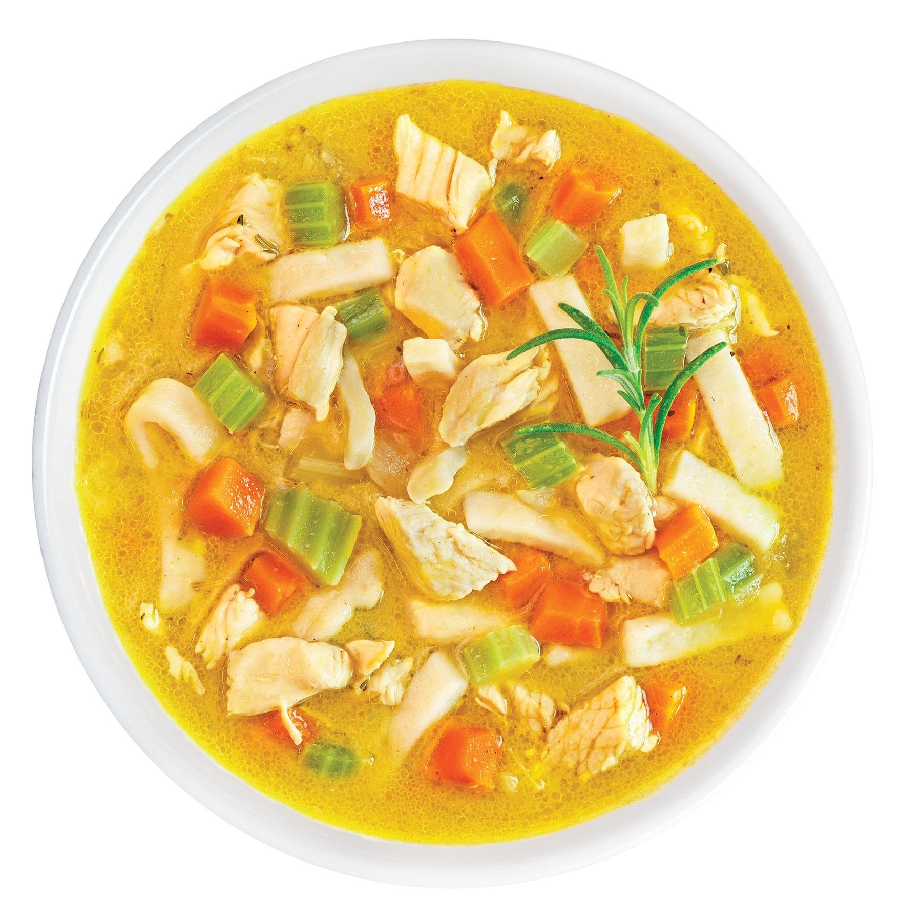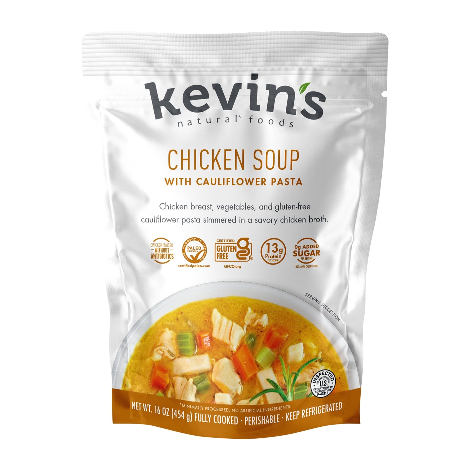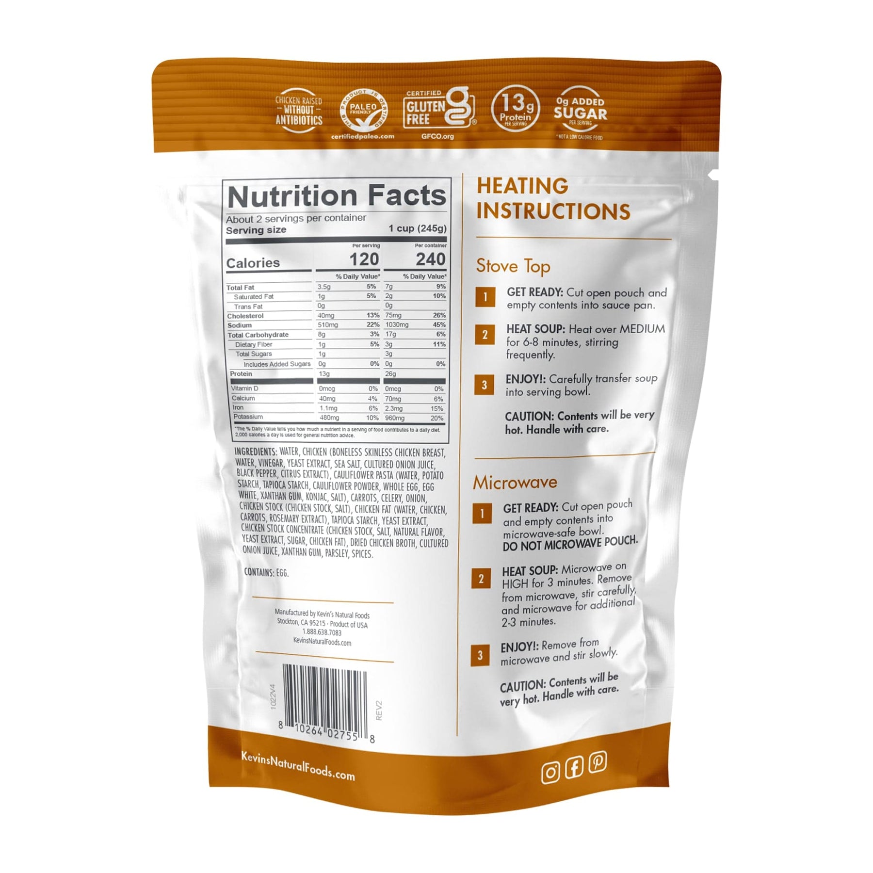 Water, Chicken (Boneless Skinless Chicken Breast, Water, Vinegar, Yeast Extract, Sea Salt, Cultured Onion Juice, Black Pepper, Citrus Extract), Cauliflower Pasta (Water, Potato Starch, Tapioca Starch, Cauliflower Powder, Whole Egg, Egg White, Xanthan Gum, Konjac, Salt), Carrots, Celery, Onion, Chicken Stock (Chicken Stock, Salt), Chicken Fat (Water, Chicken, Carrots, Rosemary Extract), Tapioca Starch, Yeast Extract, Chicken Stock Concentrate (Chicken Stock, Salt, Natural Flavor, Yeast Extract, Sugar, Chicken Fat), Dried Chicken Broth, Cultured Onion Juice, Xanthan Gum, Parsley, Spices.
