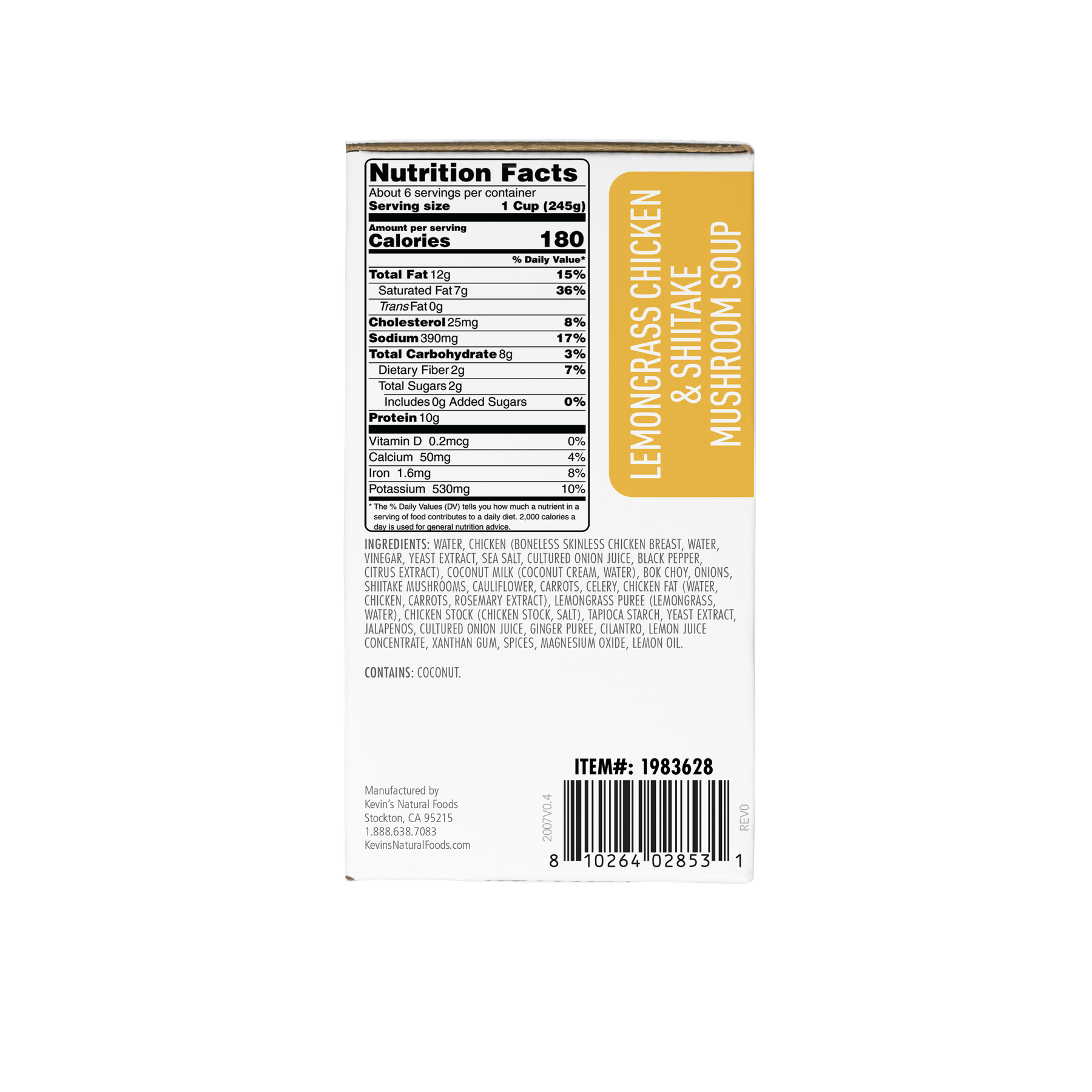 WATER, CHICKEN (BONELESS SKINLESS CHICKEN BREAST, WATER, VINEGAR, YEAST EXTRACT, SEA SALT, CULTURED ONION JUICE, BLACK PEPPER, CITRUS EXTRACT), COCONUT MILK (COCONUT CREAM, WATER), BOK CHOY, ONIONS, SHIITAKE MUSHROOMS, CAULIFLOWER, CARROTS, CELERY, CHICKEN FAT (WATER, CHICKEN, CARROTS, ROSEMARY EXTRACT), LEMONGRASS PUREE (LEMONGRASS WATER), CHICKEN STOCK (CHICKEN STOCK, SALT), TAPIOCA STARCH, YEAST EXTRACT, JALAPENOS, CULTURED ONION JUICE, GINGER PUREE, CILANTRO, LEMON JUICE CONCENTRATE, XANTHAN GUM, SPICES, MAGNESIUM OXIDE, LEMON OIL. CONTAINS: COCONUT.