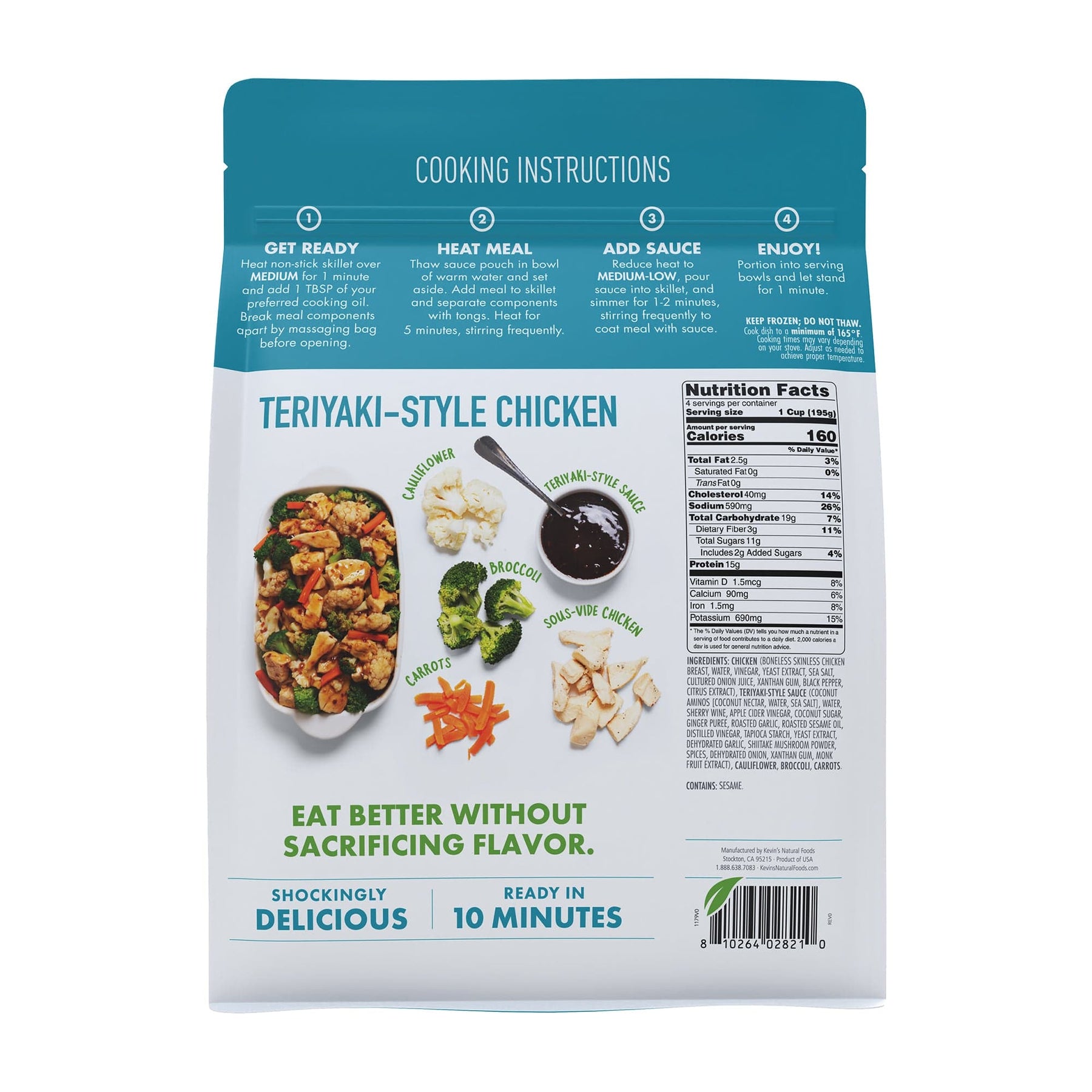 Chicken (Boneless Skinless Chicken Breast, Water, Vinegar, Yeast Extract, Sea Salt, Cultured Onion Juice, Xanthan Gum, Black Pepper, Citrus Extract), Teriyaki Sauce (Coconut Aminos [Coconut Nectar, Water, Sea Salt], Water, Sherry Wine, Apple Cider Vinegar, Coconut Sugar, Ginger Puree, Roasted Garlic, Roasted Sesame Oil, Distilled Vinegar, Tapioca Starch, Yeast Extract, Dehydrated Garlic, Shiitake Mushroom Powder, Spices, Dehydrated Onion, Xanthan Gum, Monk Fruit Extract), Cauliflower, Broccoli, Carrots.